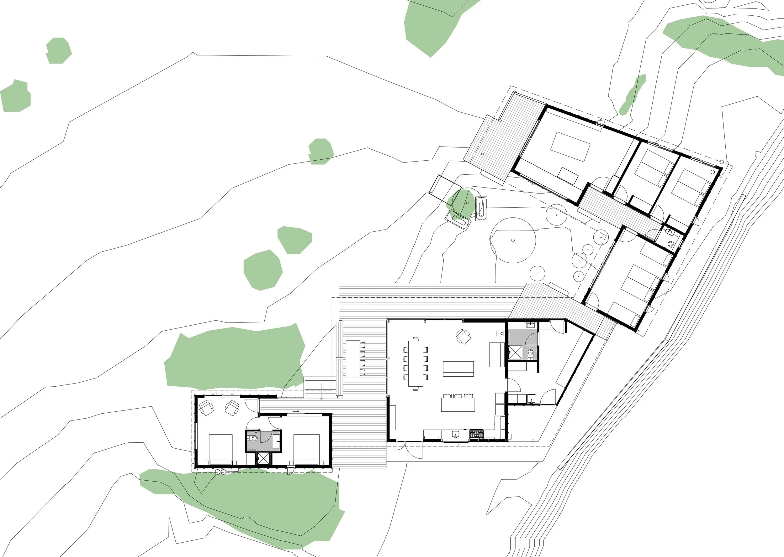 Two bedrooms, large family bedroom, games room and toilet seamlessly continue the roof of the older building and its architectural language. All spaces are accessed directly from the outside, emphasising the outdoor ‘bach’ experience.
